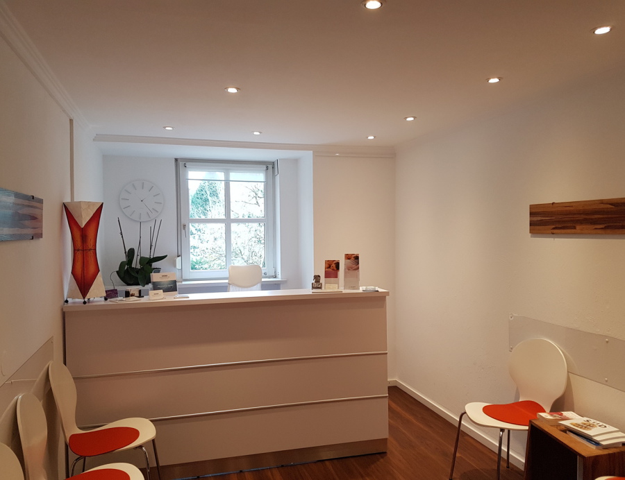 Der Empfang, Wartebereich, Toiletten, Küche und Balkon werden gemeinschaftlich genutzt. Vier verschiedene, komplett eingerichtete Behandlungsräume stehen an bis zu sechs Tagen die Woche zur